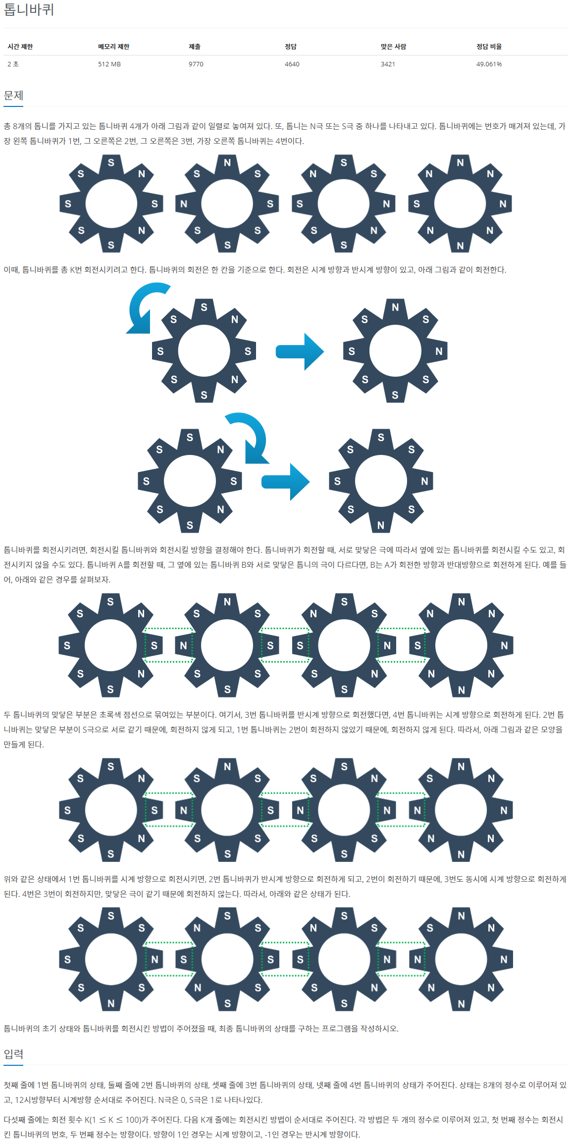 총 8개의 톱니를 가지고 있는 톱니바퀴 4개가 아래 그림과 같이 일렬로 놓여져 있다. 또, 톱니는 N극 또는 S극 중 하나를 나타내고 있다. 톱니바퀴에는 번호가 매겨져 있는데, 가장 왼쪽 톱니바퀴가 1번, 그 오른쪽은 2번, 그 오른쪽은 3번, 가장 오른쪽 톱니바퀴는 4번이다. 이때, 톱니바퀴를 총 K번 회전시키려고 한다. 톱니바퀴의 회전은 한 칸을 기준으로 한다. 회전은 시계 방향과 반시계 방향이 있고, 아래 그림과 같이 회전한다. 톱니바퀴를 회전시키려