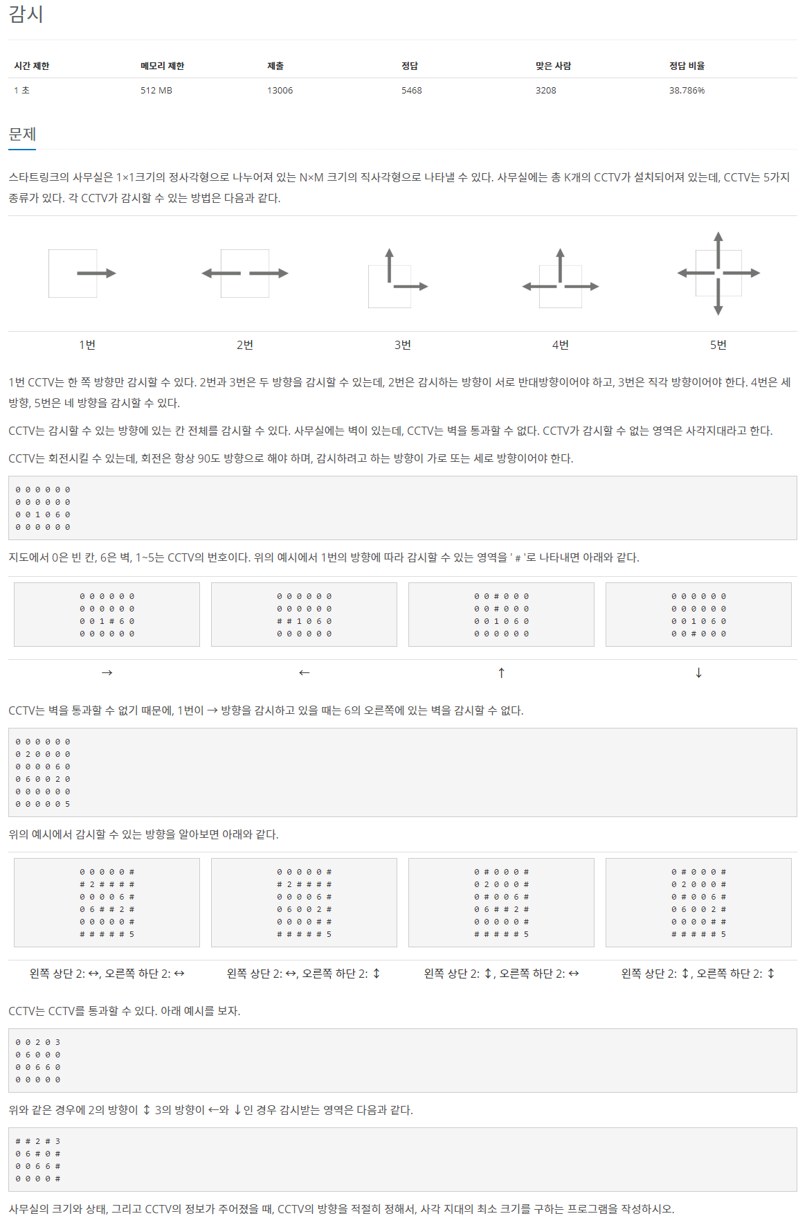 스타트링크의 사무실은 1×1크기의 정사각형으로 나누어져 있는 N×M 크기의 직사각형으로 나타낼 수 있다. 사무실에는 총 K개의 CCTV가 설치되어져 있는데, CCTV는 5가지 종류가 있다. 각 CCTV가 감시할 수 있는 방법은 다음과 같다. 1번 CCTV는 한 쪽 방향만 감시할 수 있다. 2번과 3번은 두 방향을 감시할 수 있는데, 2번은 감시하는 방향이 서로 반대방향이어야 하고, 3번은 직각 방향이어야 한다. 4번은 세 방향, 5번은 네 방향을 감시할