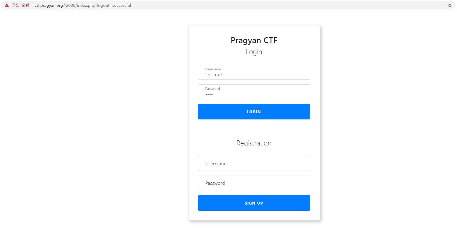 아무런 반응이 일어나는 것 같지 않았지만, ' or true-- 로 가입 후 로그인하였다.