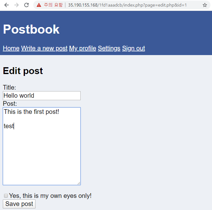 글을 수정한 후 저장하면 정상적으로 글이 수정되고, Flag가 주어진다.