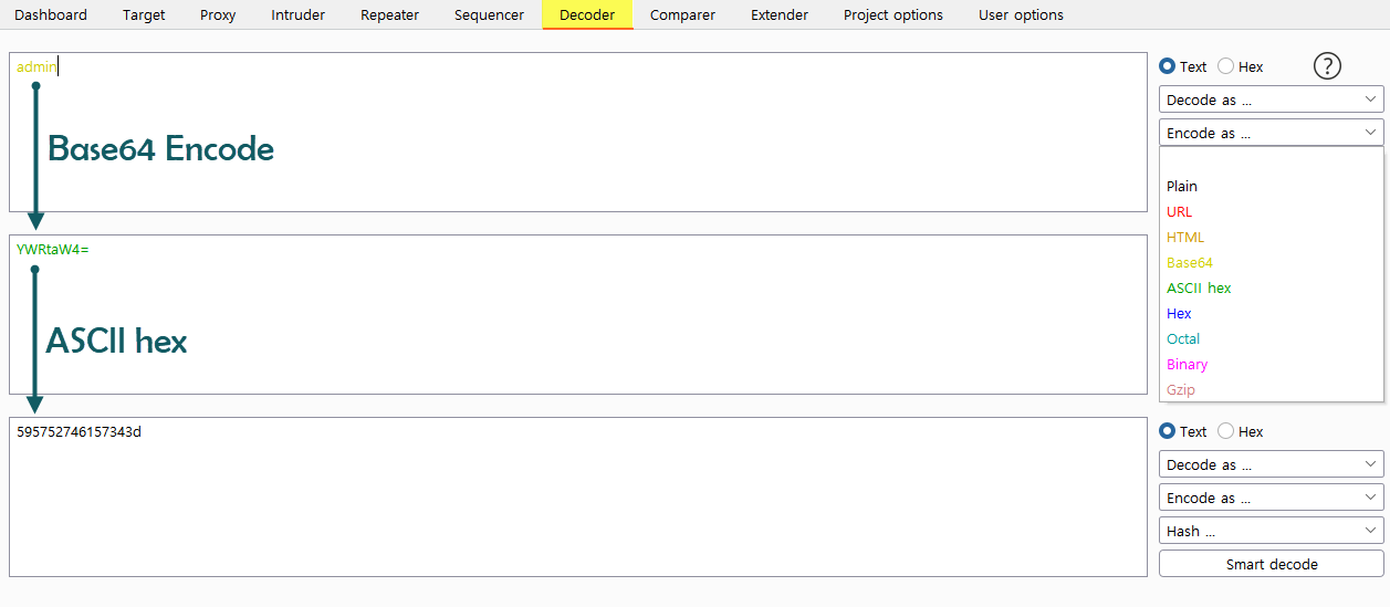 Smart decode는 아래 값이 인코딩 된 것으로 보이는 데이터를 찾아 내용을 자동적으로 디코딩하는 옵션이다.