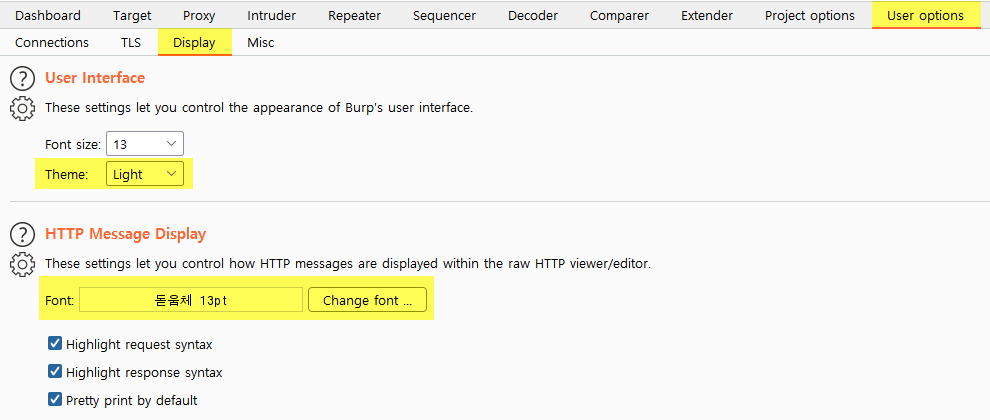 이는 Burp Suite에서 설정된 폰트가 한글을 지원하지 않는 폰트이기 때문임으로