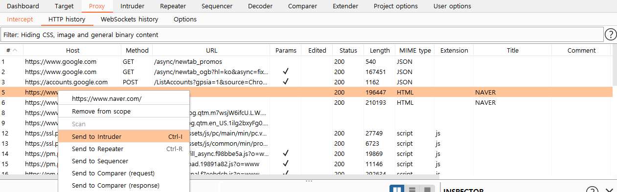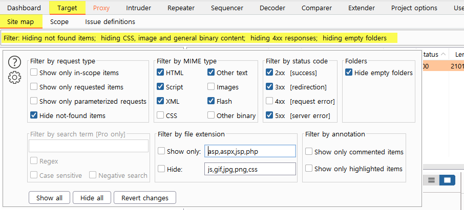 이때, request type의 필터를 통해 in-scope items만 볼 수 있도록 설정한 후,