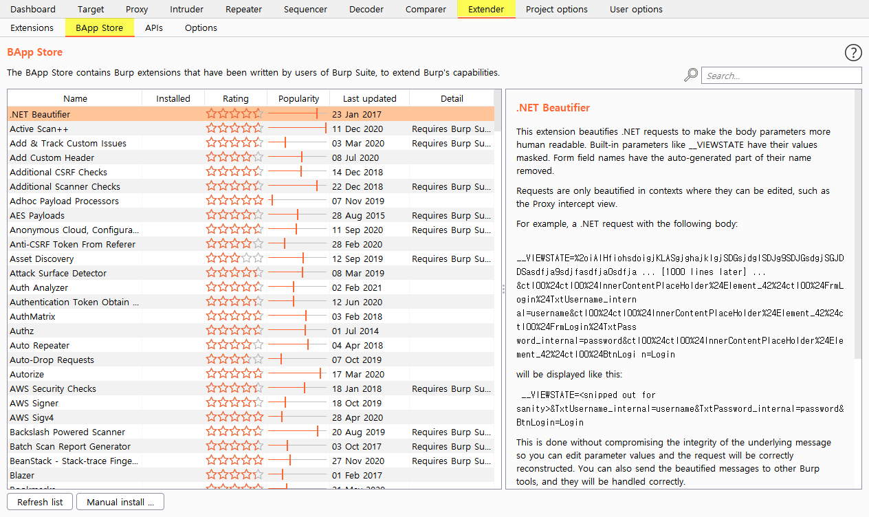 Burp Suite 사용자가 작성한 Burp 확장 기능이 있다.