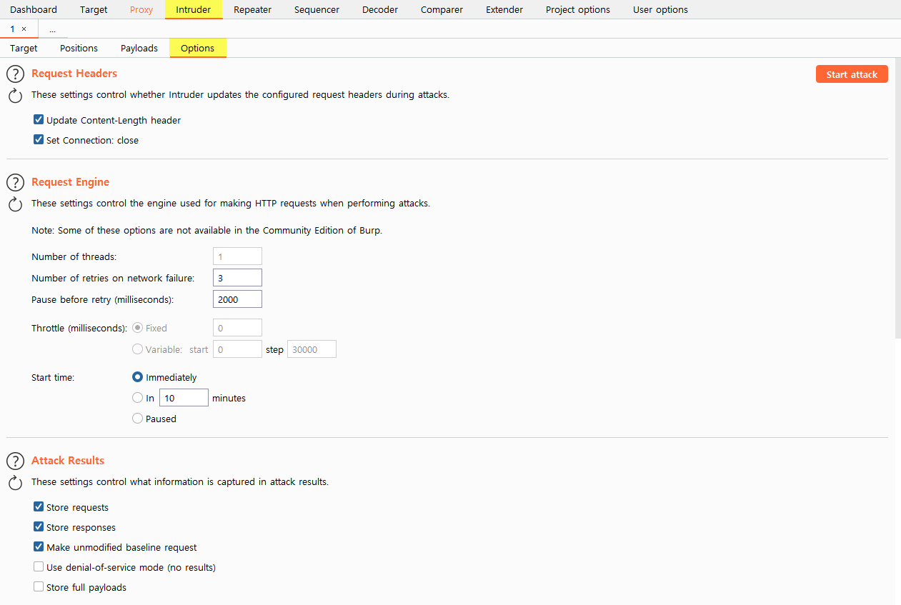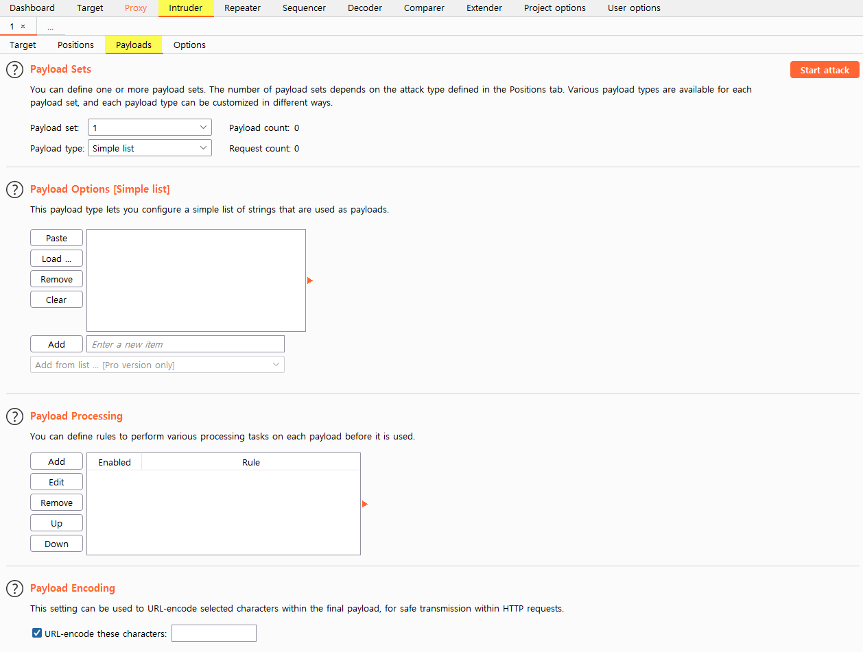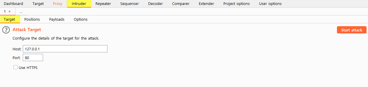 Send to Intruder을 클릭하면 자동으로 위의 값들이 설정되어 쉽게 사용할 수 있다.