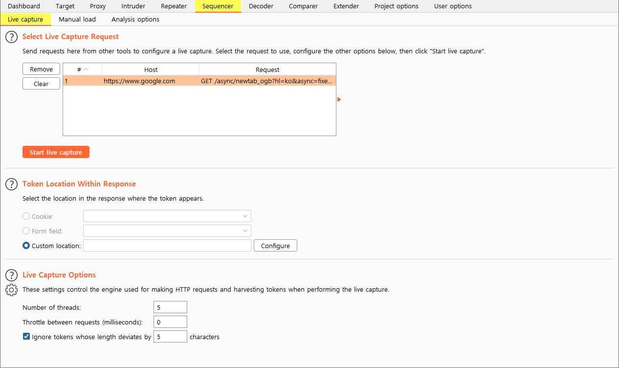 Custom location - 사용자의 임의로 항목 정의 가능Live Capture Options는 라이브 캡처 수행 시 HTTP 요청 및 토큰 수집에 사용되는 엔진을 제어 설정할 수 있다.