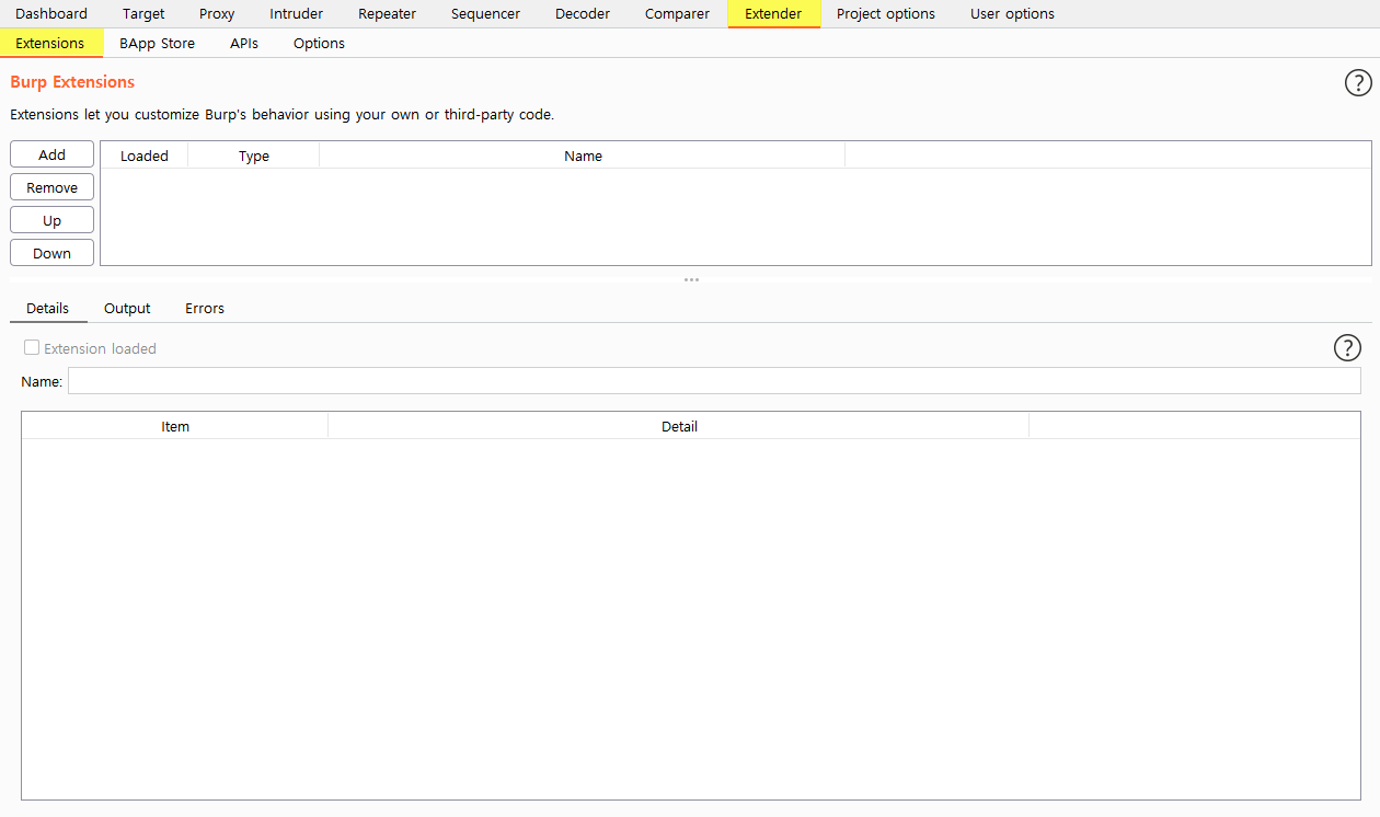 확장 기능에 대해 Extensions, BApp Store, APIs, Options에서 설치 및 사용하고 관리할 수 있다.1) Extensions