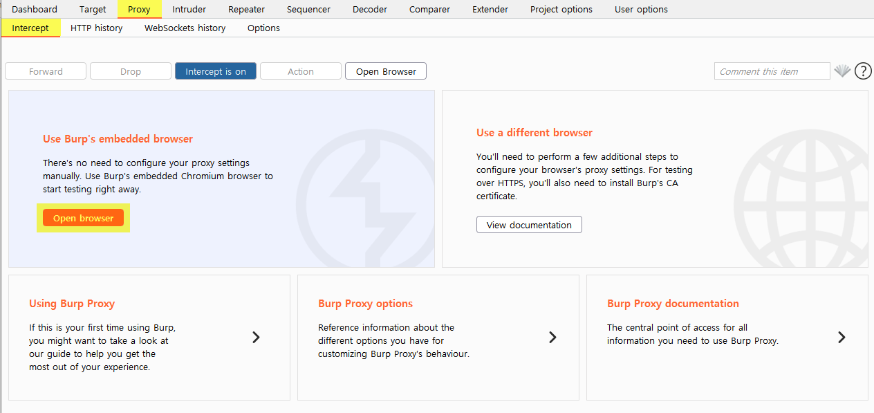 Open Browser - 별도의 프록시 설정 없이 Intercept 가능한 브라우저 창 켜짐2) HTTP history
