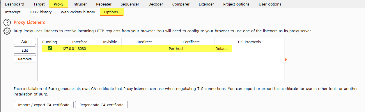 (Burp Proxy는 listeners를 사용하여 브라우저의 HTTP 요청을 수신한다.)