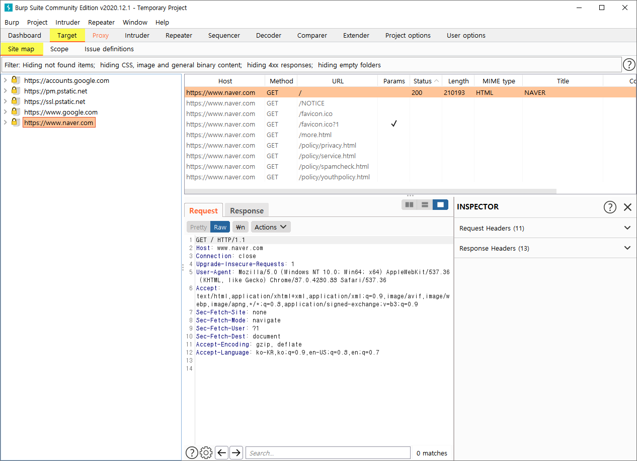 Burp Proxy를 통과한 모든 요청 및 응답에 대한 전체 기록이 저장되어 있다.