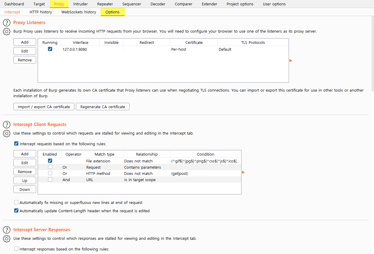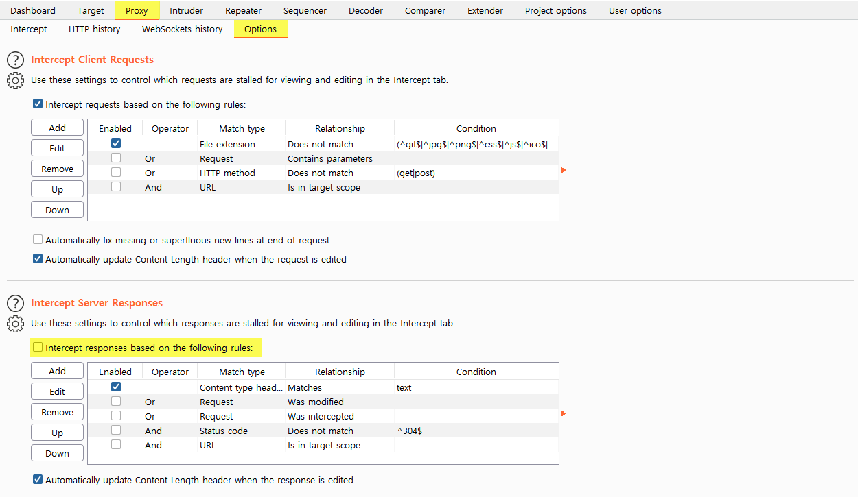 Intercept Server Responses - 서버 응답 패킷 인터셉트에 대한 규칙을 지정할 수 있다.