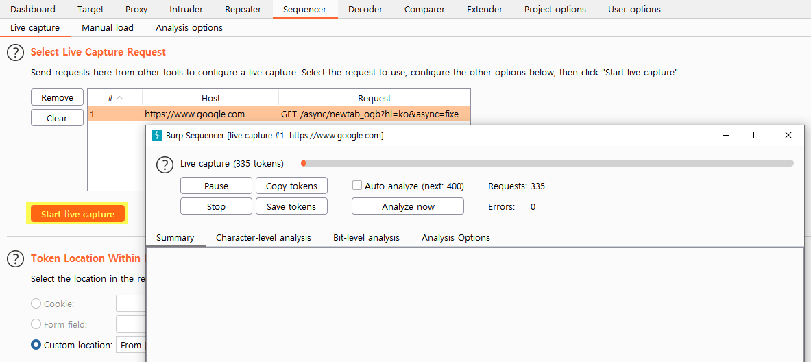 Analyze now - 최소 100개의 토큰이 캡처되면 Burp가 현재 샘플을 분석 후 결과 업데이트2) Manual load