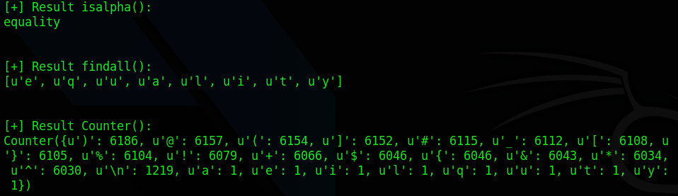import requests import re import collections def printResult(func, result): print("[+] Result %s:" % func) print(result) print("\n") def getData(): url = "http://www.pythonchallenge.com/pc/def/ocr.html" r = requests.get(url) s = r.text.find("%%$@_$^__#)") data = r.text[s:-6] return data if __name__ == "__main__": data = getData() ###### isalpha() ###### result1 = "" for i in data: if i.isalpha(): result1 += i printResult("isalpha()", result1) ###### findall() ###### printResult("findall()", re.findall("[A-Za-z]", data)) ###### Counter() ###### printResult("Counter()", collections.Counter(data))[실행 결과]